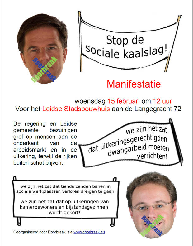 We zijn het zat dat bijstandsgerechtigden worden gekort op hun uitkering en worden verplicht tot dwangarbeid. Daarom voeren activisten en sympathisanten van Doorbraak op 15 februari actie voor zelfbeschikking en een leefbaar inkomen, met onder meer een quiz over asociale politici, het ballenwerpspel “Bekogel de bestuurders” en het oprichten van een klaagmuur tegen de bezuinigingen. Laat je stem horen, en kom ook meedoen!