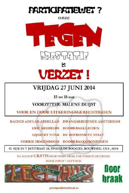 Op vrijdag 27 juni 2014 vindt er van 15:00 - 18:00 uur een bijeenkomst plaats tegen de nieuwe participatiewet, in het harmoniegebouw van de universiteit.
