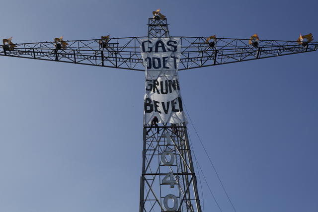 Klimmers van actiegroep GroenFront! Groningen hebben zaterdag 4oktober groot spandoek opgehangen in de door Gasunie gesponsord kunstwerk in de vorm elektriciteitsmast met gasvlammen langs de A28. Gas Doet Grunn Beven. Liz van GroenFront! Groningen “ Na de gasbeving bij Ten Boer van dinsdag had Kamp het over ' a fact of life' Wij zouden hem er graag op willen wijzen dat gasbevingen veroorzaakt worden door gaswinning. En het Gasbesluit dat Kamp en de NAM deze maand definitief willen vaststellen gaat nog steeds uit van een gevaarlijk hoge gasproductie. Op deze manier is het dweilen met de gaskraan open. ” Volgens GroenFront! moet de gasproductie veel verder omlaag om de kans op zware gasbevingen te voorkomen en het risico op meer instortende huizen te verkleinen.