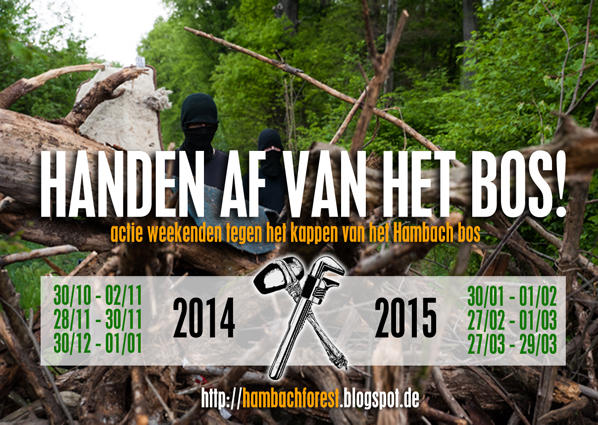 ** Het eeuwenoude Hambacher Forst wordt sinds de lente van 2012 op verschillende plaatsen bezet. Het doel is de uitbreiding van de giga-grote Rheinland bruinkoolmijnen tegen te houden, de grootste bron van CO₂ vervuiling in Europa, op slechts 35 kilometer van de Nederlandse grens bij Roermond.