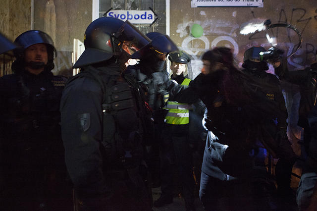 As media were surprisingly more on squatters' side this time, next day the police came up with very lame story of anarchists trying to burn a police car "as a revenge for Klinika". In disclosed video, they didn't even manage to make the "damaged" car dirty from flames and Klinika disavowed from this act immediately, so noone moderately sane could believe their tale. But mainstream media enjoy blood, so they turned their approach to the case back to their beloved witch hunt against squatters and anarchists. Moreover, the promised negotiations with authorities, which could possibly help to find a solution for Klinika, are more about lying and explaining why it's not possible to do anything at all.