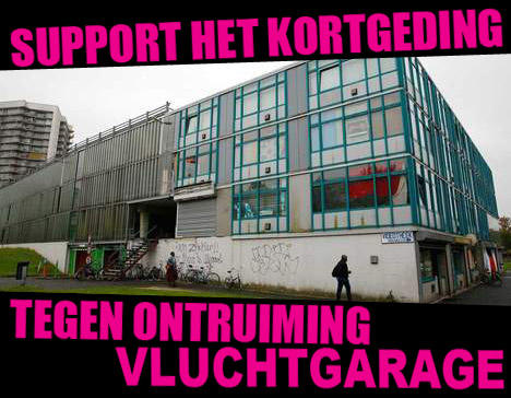 op vr 30 januari om 9.30 aan de parnassusweg 220 dient het kortgeding tegen de ontruiming van de vluchtgarage. we vinden het onaanvaardbaar dat de overheid ons op straat zet! de nachtopvang is geen alternatief. we staan daarmee overdag letterlijk op straat.