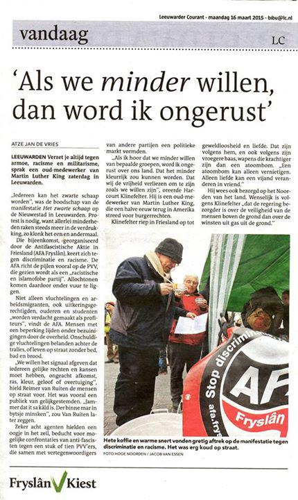 Komende zaterdag is er in het centrum van Leeuwarden om 14:00 uur, op de Lange Pijp nabij het waaggebouw, een manifestatie tegen discriminatie en racisme. Dit jaar hebben we als sprekers; Harcourt Klinefelter (in de jaren 60 pr-medewerker van Martin Luther King) een woordvoerder van de voormalige Noodopvang Witmarsum (vervanger van Willemijn van der Werf), Genghis Caracan (de voorzitter van het moskeebestuur in Drachten) en Reimer van Ruiten (AFA-Fryslan). De manifestatie is gelijktijdig aan de provinciale verkiezingsmarkt. "Voor het slagen van het kwaad is niets anders nodig dan dat goede mensen niets doen. Als goede mensen niets anders doen dan voor hun gezinsleden zorgen, hun sport beoefenen, televisie kijken, kunnen kwadere krachten ongestoord hun onzalige praktijken uitvoeren. De kwade krachten worden dan niet gehinderd door de zogenaamde zwijgende meerderheid." (Martin Luther King)
