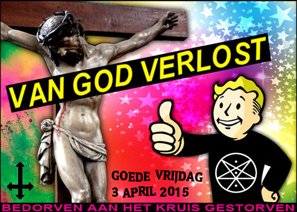aanstaande vrijdag 3 april is het weer zover . . . dan bejubelen we met goede vrijdag de DOOD van god en vieren we onze verlossing van die genocidale terrorist die de mens zo lang onderdrukt heeft. met dank aan de joden en het romeinse bezettingsleger in palestina kwam er ruim 2000 jaar geleden een einde aan de wrede overheersing van god over de mens.