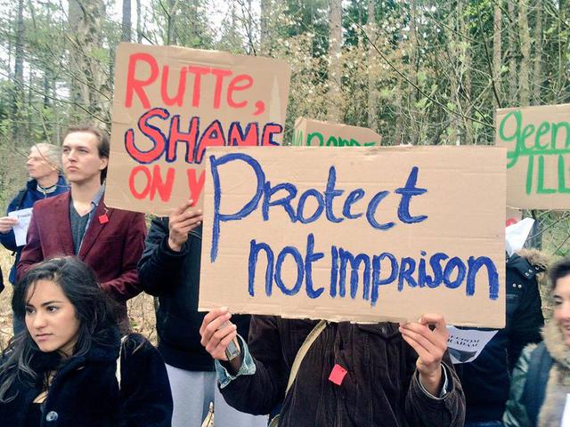 Zo'n zestig studenten, vluchtelingen van Wij Zijn Hier en andere sympathisanten hielden vanmiddag een lawaai-demo bij het immigratie detentie-centrum in Zeist.