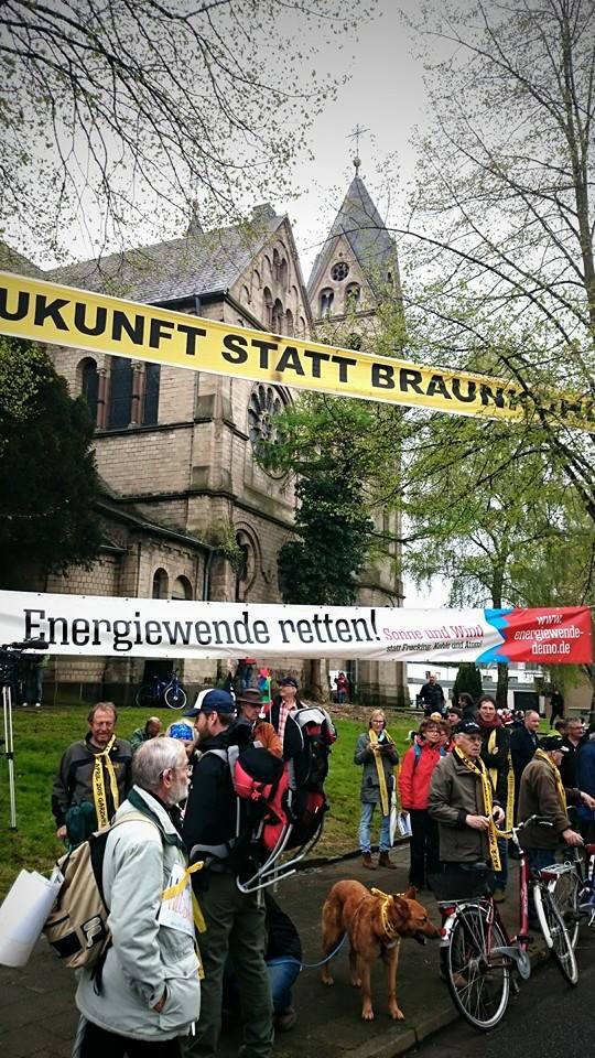 Duizenden mensen hebben gisteren in het Duitse grensgebied (Rijnland) een menselijke keten van maar liefst 7,5 kilometer gevormd als protest tegen de almaar uitdijende bruinkoolwinning in het gebied.