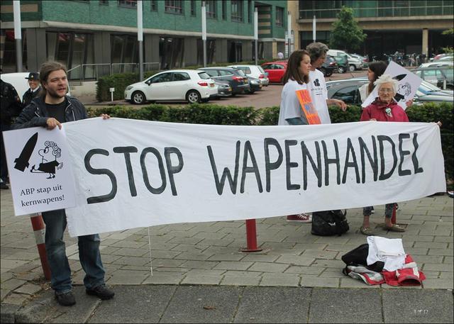 Kleine sfeerimpressie bij de demonstratie, vanmiddag, bij de entree van de aandeelhoudersvergadering van kernwapenboer Airbus in het Okurahotel in Amsterdam. Er waren zo'n 40 bezorgde mensen aanwezig om de aandeelhouders te 'verwelkomen'. Wendela de Vries van 'Stop Wapenhandel' heeft met een paar aandeelhouders gesproken. Ook heeft zij de aanwezige bezorgde mensen toegesproken en bijgepraat met achtergrondinfo over Airbus