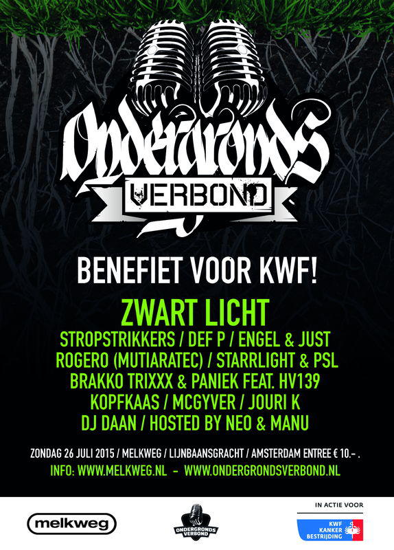 Daarom heeft de organisatie van het Hiphop festival "Ondergronds Verbond” de handen ineen geslagen met het kernpodium De Melkweg te Amsterdam om een benefiet-evenement te bewerkstelligen onder de naam “Benefiet voor KWF Kankerbestrijding” waar tien hiphop-acts zich belangeloos zullen inzetten door middel van een show en zo hun steentje bijdragen aan de strijd tegen deze ziekte.