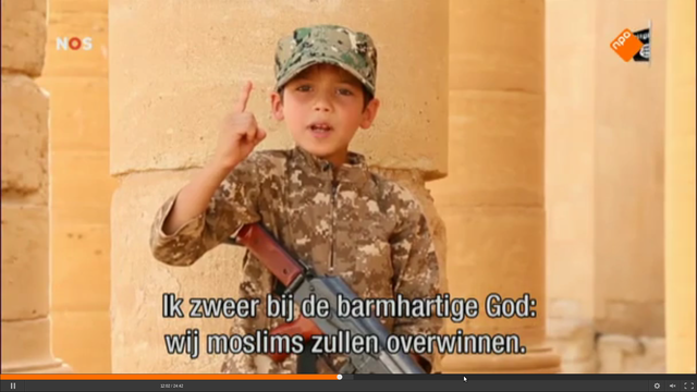 Die godsdienst fanatici lukt het keer op keer een podium te krijgen door Twitter Facebook en... het NOS journaal. Het NOS journaal is op zich niet vies van zelfcensuur maar niet in geval IS kind soldaten. De onthoofding video s laat NOS alleen zonder het moment supreme zien. Is de aanblik van zo 'n jongetje zo 'n kind soldaat minder schokkend dan een onthoofding ? Blijkbaar volgens de journaal redactie. Ik stel zwijg die godsdienst fanatici dood geef ze geen podium meer op wat voor manier ook. Het plaatje bij deze opinie is een screenshot item kind soldaten IS van dinsdag 28 juli 2015 20:00. Nu geef ik ze zelf een podium door deze bijdrage ?! Ik houd het kort.