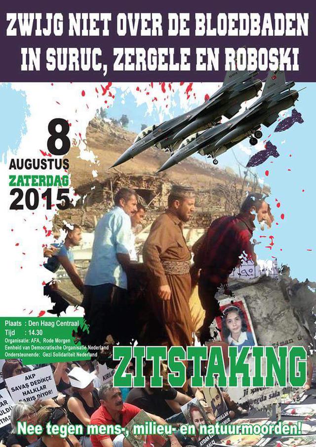 Aanstaande zaterdag zullen Koerden en sympathisanten op Den Haag Centraal Station een zitprotest houden als protest tegen de bombardementen van de Turkse luchtmacht op Koerdische stellingen in Irak en Syrië en tegen de gruwelijke daden van IS. Ook is het protest een gebaar van solidariteit met de inwoners van Suruc, Zergele en Roboski, waar de afgelopen dagen bloedbaden werden aangericht onder de Koerdische bevolking.