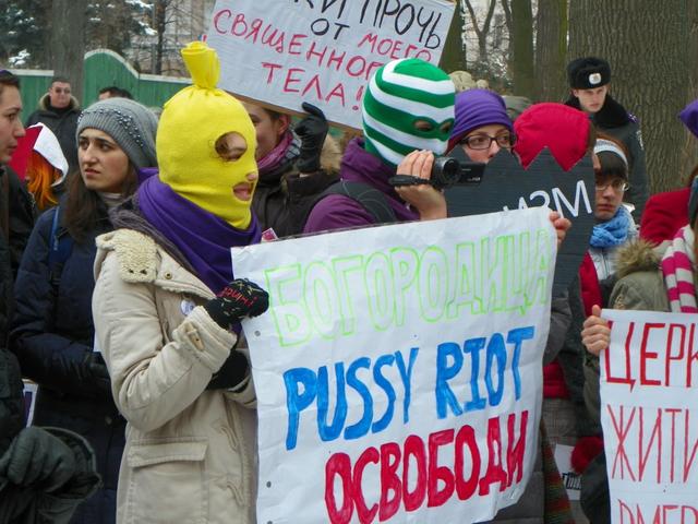 "De aanklacht tegen hen luidt 'hooliganisme' met religieuze haat als motief. De jonge vrouwen zijn sinds de dag van hun arrestatie in hongerstaking en gisteren werd er in Moskou voor het hoofdbureau van de politie gedemonstreerd voor hun vrijlating. 'Het is verkeerd om hen zo lang in voorarrest te houden. Ze hebben allebei kleine kinderen', zegt Olga, een 19-jarige studente tegen Radio Free Europe. 'Daarom sta ik hier."