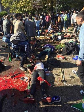 Today, on the 10th of October, the “Labor, Democracy and Peace Meeting” that was organized by various unions, associations and organizations has been attacked. Like in Amed on June and in Suruc on July, the bombs exploding in Ankara today has killed tens of people.