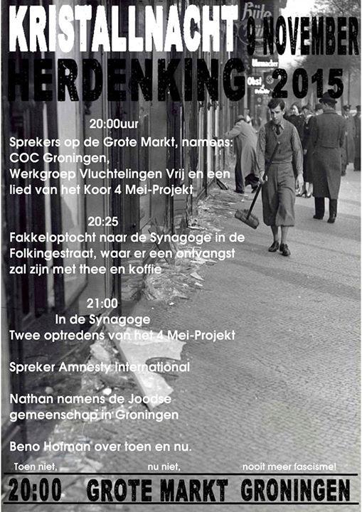 Op 9 november wordt vanaf 20.00 uur op de Grote Markt in Groningen een Kristallnachtherdenking georganiseerd door Amnesty International, COC Groningen & Drenthe, Sociaal Centrum Groningen, Stichting Folkingestraat Synagoge en de Werkgroep Vluchtelingen Vrij.