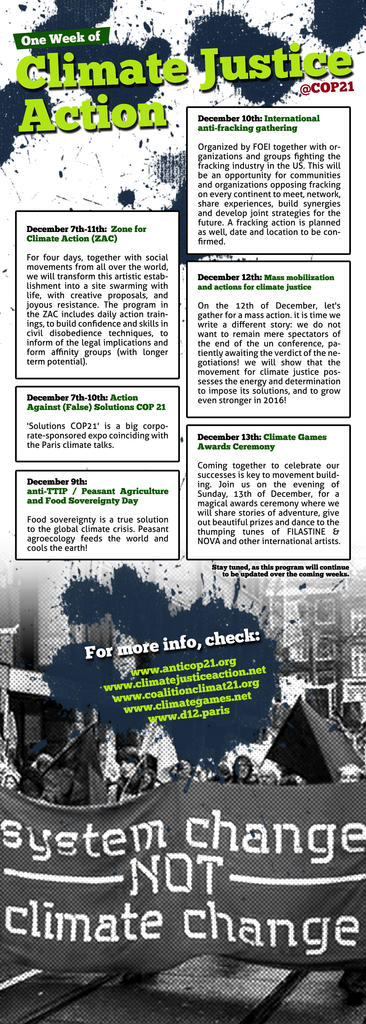 On the 12th of december, let's gather for a mass action. it is time we write a different story: we do not want to remain mere spectators of the end of the un conference, patiently awaiting the verdict of the negotiations! we will show that the movement for climate justice possesses the energy and determination to impose its solutions, and to grow even stronger in 2016!