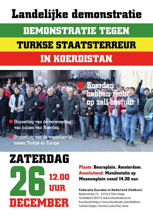 Fedkomroept de Nederlandse regering op in elk gesprek tussen Turkije, Nederland en de EU het vredesproces bovenaan de agenda te zetten zodat de strijdende partijen de vredesonderhandelingen hervatten. Koerden protesteren tegen deze aanvallen van de Turkse strijdkrachten. Hiervoor gaan Koerden op 18-12-2015 in Den Haag voor de Tweede Kamer protesteren en op 19 december op het Spuitplein in DenHaag. Fedkom roept iedereen op solidair met deze protestacties te zijn!