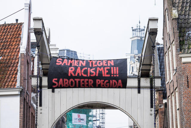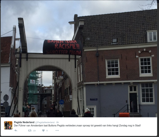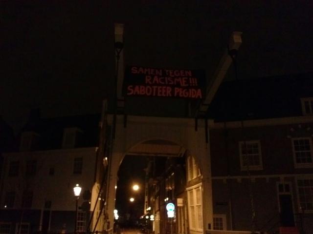 Afgelopen nacht is er een spandoek opgehangen in Amsterdam voor een oproep tot actie tegen de PEGIDA demonstratie op 6 februari.