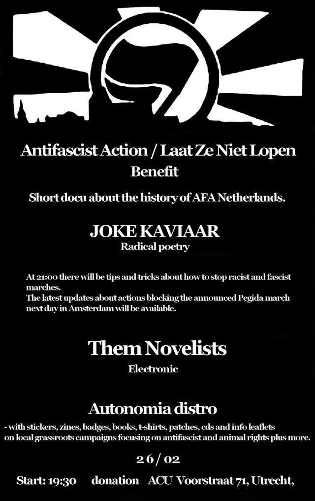 A night with all aspects of anti-fascism, history, art and party! There will be a short docu about the history of AFA Utrecht. Followed by radical poetry from Joke Kaviaar. AFA stickers, shirts and more will be available. At 21:00 there will be tips and tricks about how to stop racist and fascist marches. The latest updates about actions blocking the announced Pegida march in Amsterdam will be available. Them Novelists and more will play to get the party started.