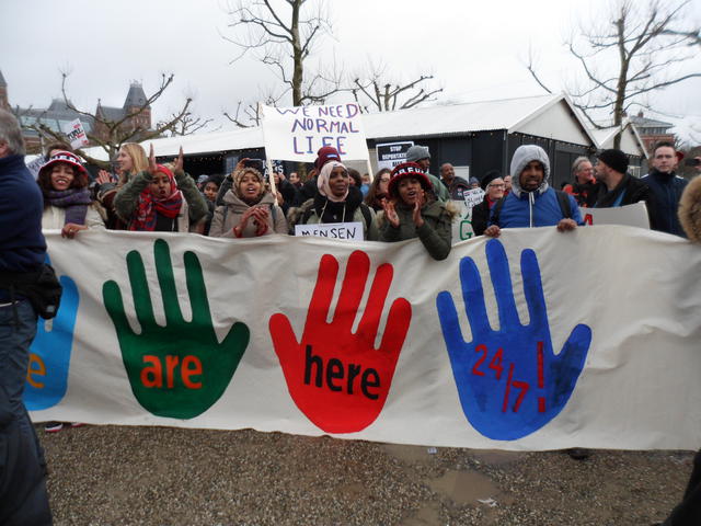 Wij, de vluchtelingen van ‘WIJ ZIJN HIER zijn tussen wal en schip terecht gekomen. Wij komen uit Somalië, Eritrea, Ethiopië, Libië, Soedan, Zuid- Soedan en verschillende landen in West- en Centraal-Afrika, zoals Ivoorkust, Centrale Republiek, Burundi en Congo. In de Nederlandse ambtsberichten en in rapporten van Amnesty International, UNHCR en Human Rights Watch wordt de mensenrechtensituatie in deze landen als alarmerend en zorgwekkend omschreven. Wij hebben hier stuk voor stuk een asielaanvraag gedaan, maar onze aanvragen zijn afgewezen. Na afwijzing zijn wij verplicht om Nederland binnen 48 uur vrijwillig te verlaten. Wij kunnen echter niet aan deze verplichting voldoen omdat de landen, waar we naar terug zouden moeten keren, onveilig zijn door oorlog of mensenschendingen. Ambassades weigeren ook herhaaldelijk inreisvisa. Velen van ons zijn voor gruwelijke situaties gevlucht en/of hebben een traumatische vlucht meegemaakt. Vervolgens verkeren velen van ons in Nederland al jarenlang in traumatische situaties. We lopen voortdurend het risico gearresteerd te worden omdat we geen papieren hebben.
