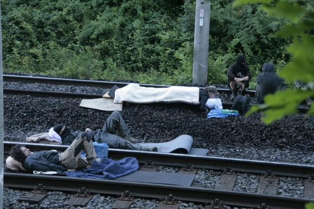 Op een van de actie dagen, rond 10 uur in de ochtend, maakten ik en een andere persoon ons vast aan de rails. Ieder aan 1 kant. Waardoor er geen trein meer door kon. Binnen een uur was de politie aanwezig. Ze begonnen meteen aan mijn armen te trekken en pijnprikkels te geven om te kijken of ik wel echt vast zat. Ze negeerde mijn protesten omdat ze in het Engels waren, pas toen de andere in het Duits zei dat we inderdaad vast gelockt waren lieten ze me met rust.