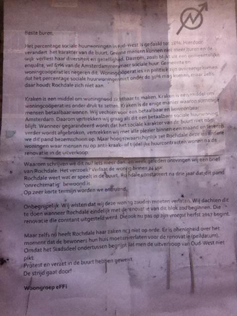 Kraken is een middel om woningnood zichtbaar te maken. Kraken is een middel om woningcoöperaties onder druk te zetten. Kraken is de enige manier waarop sommige mensen betaalbaar wonen. Wij vechten voor een betaalbaar en bewoonbaar Amsterdam. Daarom vertrekken wij graag als dit een betaalbare sociale huurwoning blijft. Wanneer gegarandeerd wordt dat het sociale karakter van de buurt niet nog verder wordt afgebroken, vertrekken wij met alle plezier binnen een maand en leveren we dit pand bezemschoon op. Maar hoogstwaarschijnlijk zet Rochdale deze en andere woningen waar mensen nu op anti-kraak- of tijdelijke huurcontracten wonen na de renovatie in de uitverkoop.