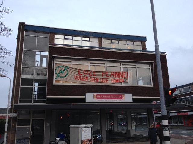 Vandaag is de actie publiekelijk gemaakt door het gebouw te voorzien van barricade, spandoek en een overhead projector met leuke plaatjes. De opkomst voor solidariteit met de kraak viel behoorlijk tegen, gelukkig gaan wij gewoon door.