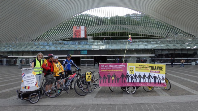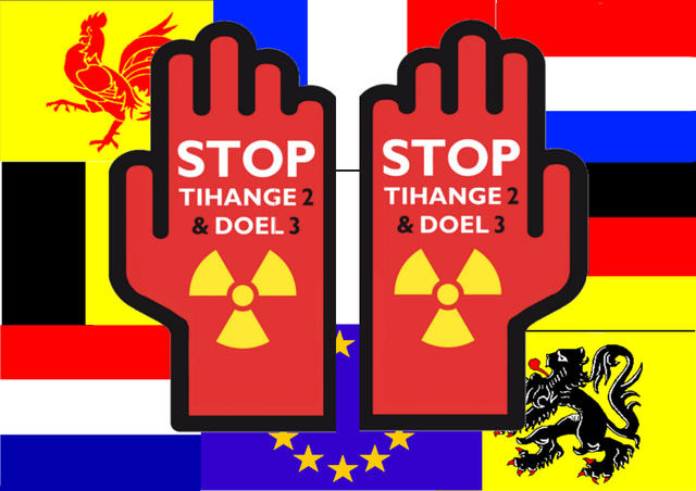 Actie tegen de zeer gevaarlijke door vele onregelmatigheden geteisterde kerncentrale bij Tihange (o.a. aantasting door betonrot), gelegen grofweg bij het drielandenpunt Nederland - Duitsland - België.