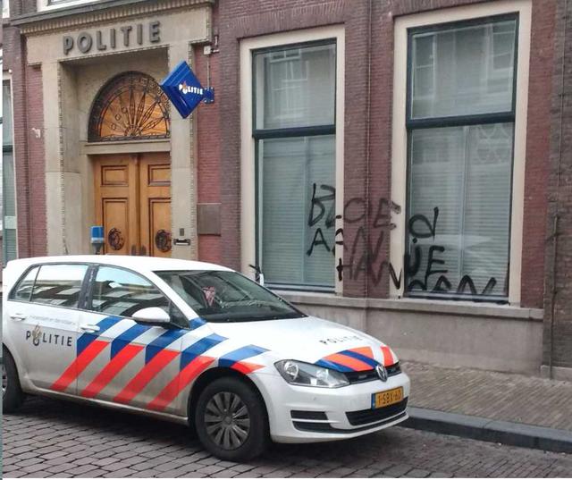 In de nacht van donderdag op vrijdag is er op een politiebureau in Dordrecht de tekst " bloed aan je handen" aangebracht .
