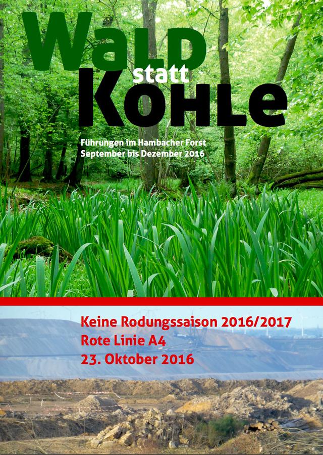 Aansluitend aan de rondleiding vindt er een red-line actie plaats. Door met z'n allen in rode kleding een menselijke ketting te vormen tussen de mijn en het bos willen we een krachtig signaal afgeven, namelijk: tot hier en niet verder! Red het hambach bos! Bij de 'Wald statt Kohle' op 23 Oktober, waren er al 1000 mensen van jong tot oud. We verwachten nog meer media-aandacht bij internationale opkomst. Dus kom de actie-voerders in Duitsland ondersteunen, want het is een inspiratie voor Nederland.