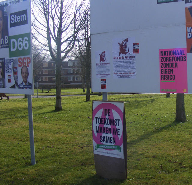 Als Kout een sandwichbord – met aan de ene kant een boodschap van de AFA en aan de andere kant een van de ‘anarchistische zelforganisatie Vrije Bond’ – aan een vlaggenmast voor het gemeentehuis wil bevestigen, staat er binnen een minuut een ambtenaar op de stoep. De vlaggenmast valt niet onder de openbare ruimte, verkondigt hij resoluut. Kout wijkt uit naar een lantaarnpaal.