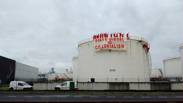 Een groep van 25 personen is zaterdagochtend het terrein van benzinehandelaar Vitol in de haven van Amsterdam binnengedrongen om de werkzaamheden op het terrein stop te zetten. De boodschap van de actievoerders: stop met de export van gifbenzine naar West-Afrika – en maak een einde aan het tijdperk van fossiele brandstoffen.