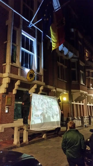 Deze beelden zijn op een groot scherm geprojecteerd op het Duitse consulaat. Tevens zijn er kaartjes achtergelaten met boodschappen van verschillende mensen aan Frau Merkel. De actie werd gadegeslagen door een een aantal politieagenten te paard.