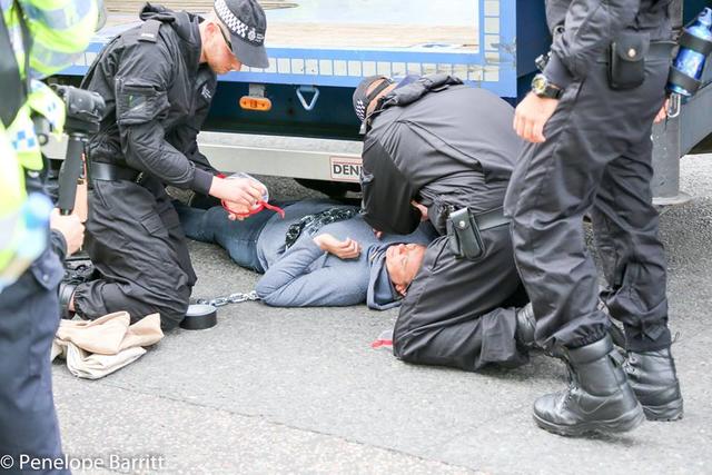 Het thema van vandaag, de tweede dag, was ‘No faith in war‘. Verschillende kerkelijke groeperingen kwamen in actie. Ik dacht eigenlijk dat dit een rustige, gematigde en gemoedelijke dag zou worden, maar dat had ik verkeerd ingeschat. Toen ik vanochtend vroeg op de actielocatie aankwam, lagen er al vier mensen in een lock-on en de structuur van die lock-ons was zo uitgekiend dat de special teams meer dan een uur bezig zijn geweest om de actievoerders los te krijgen.
