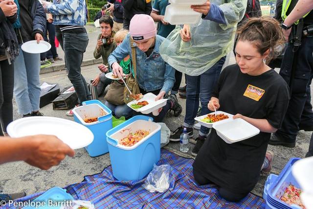 Dag 4 werd georganiseerd door Lesbians and Gay Support the Migrants rond het thema van migratie: 'Free Movement for People not Weapons!'. Er waren workshops van de All African Women's Group en Women of Colour in the Global Womens Strike, en een smakelijke picknick met eten van Food bot Bombs. Midden op de weg, natuurlijk.