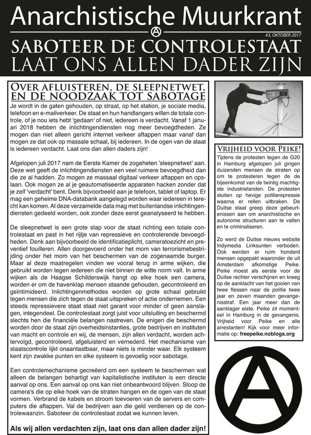 Hier de derde uitgave van de Anarchistische Muurkrant oktober 2017. Ditmaal gaat de Muurkrant over, over afluisteren, de sleepnetwet, en de noodzaak tot sabotage. Download de Muurkrant, print en verspreid!