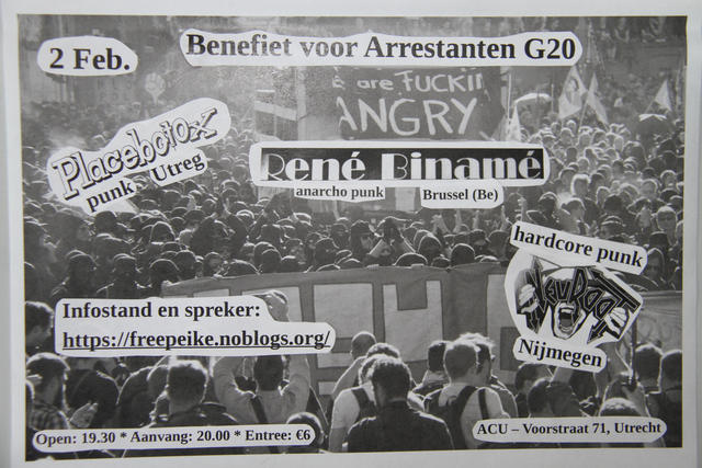Dit benefiet wordt georganiseerd om aandacht te vragen en geld op te halen voor de arrestanten van de G20, Hamburg 2017. De Amsterdamse Peike zit al sinds de G20 in juli opgesloten. Hij en de