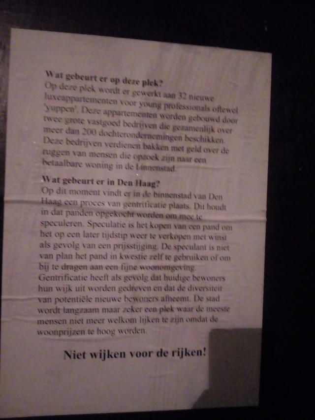Kleine directie actie tegen de bouw van yuppenappartementen in de Lange Lombardstraat in centrum Den Haag. Het is ons ter oren gekomen dat hier binnenkort de bouw van de zoveelste luxeappartementen plaats gaat vinden, het centrum word zo alleen nog maar en plek voor mensen met een groot kapitaal.