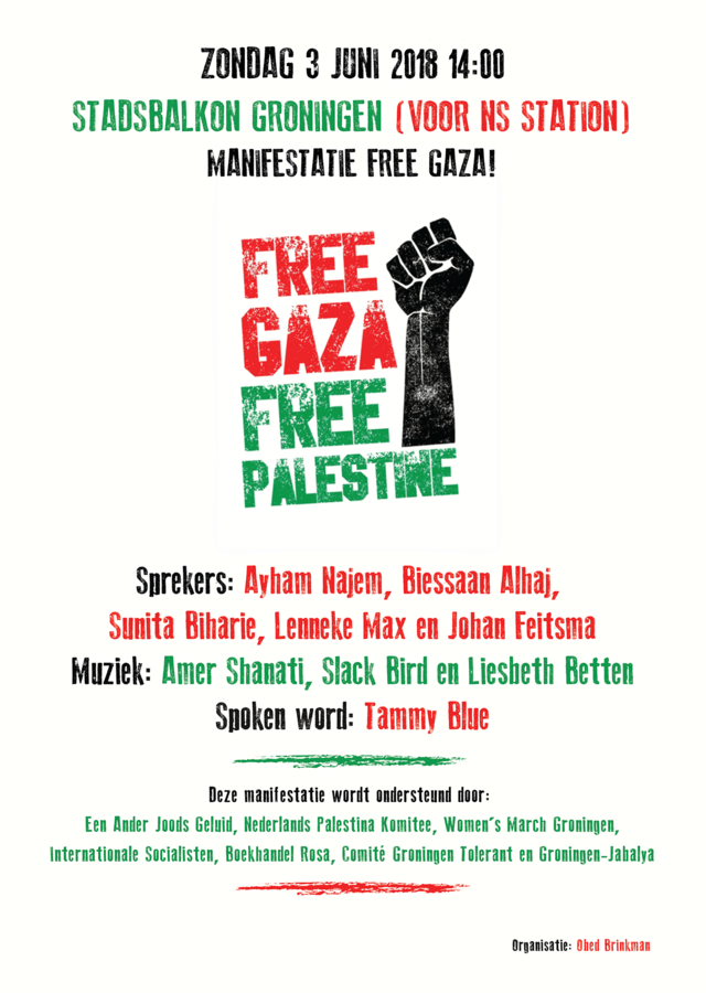 De manifestatie wordt ondersteund door Een Ander Joods Geluid, Nederlands Palestina Komitee, Internationale Socialisten Groningen,
