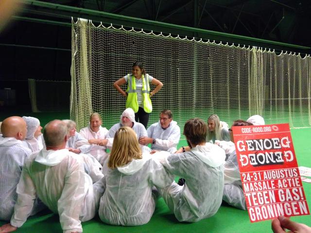 Afgelopen zaterdag hebben twintig mensen een actietraining gevolgd in Delfzijl, noord-oost Groningen. De training is een oefening voor de Code Rood actie deze zomer. Vanaf 28 augustus zullen honderden mensen met een zitblokkade het NAM tankenpark bij Delfzijl blokkeren. Zo ontregelen zij de gaswinning in Groningen. De groep eist dat de gaskraan dicht gaat en wil een rechtvaardige compensatie voor iedereen die lijdt onder de gevolgen van de gaswinning.