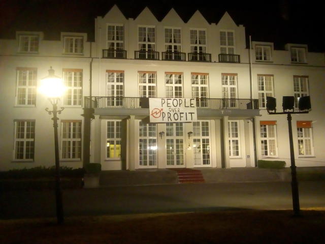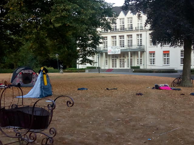 Tot ze een nieuwe woonplek hebben, heeft de groep besloten voor het gemeentehuis te bivakkeren. die ze verantwoordelijk acht voor hun huidige woningloze situatie. Vanochtend is er een spandoek vanaf het balkon van het gemeente huis gehangen met de tekst “People over profit”.