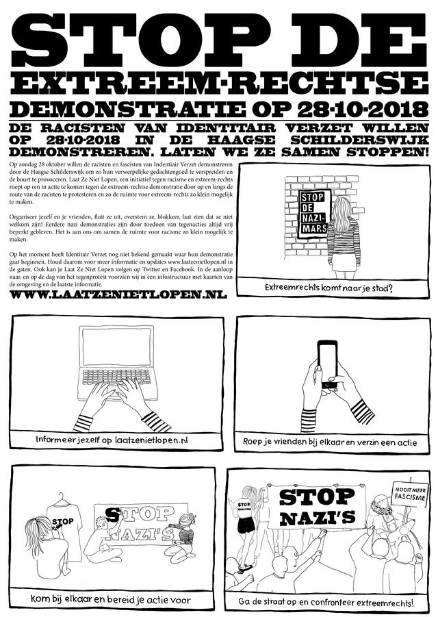 Op zondag 28 oktober willen de racisten en fascisten van Indentiair Verzet demonstreren door de Haagse Schilderswijk om zo hun verwerpelijke gedachtegoed te verspreiden en de buurt te provoceren. Laat Ze Niet Lopen, een initiatief tegen racisme en extreem-rechts roept op om in actie te komen tegen de extreem-rechtse demonstratie door op en langs de route van de racisten te protesteren en zo de ruimte voor extreem-rechts zo klein mogelijk te maken.