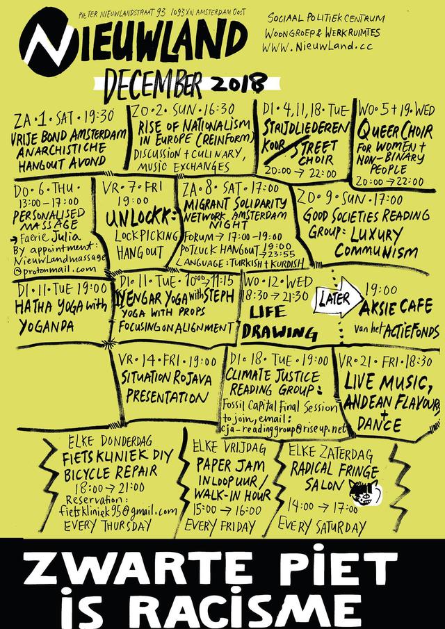 NieuwLand is solidary and self-built space for living and working, and a non-commercial, volunteer-run social-political centre in Dapperbuurt, Amsterdam Oost. The NieuwLand collective organises a monthly program with documentary, film and discussion nights, workshops, garden days, chess nights, and other social, cultural and political events for the neighborhood and beyond.