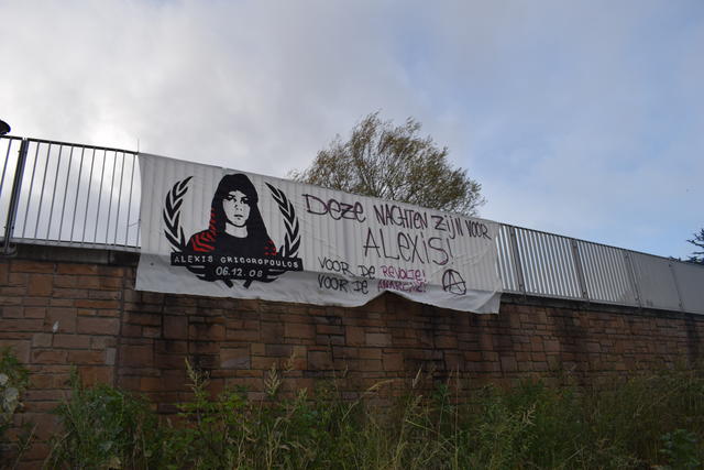 Het is tien jaar geleden dat Alexis Grigoropoulos werd doodgeschoten door de politie in Athene. In het teken hiervan is een spandoek opgehangen en is er wat graffiti gespoten in de Haagse binnenstad.
