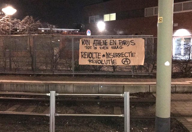 Last night a dozen anarchists made a walk through the Schilderswijk in Den Haag. Five banners were hung at different locations and flyers were spread with the title “Solidarity with those who revolt”.