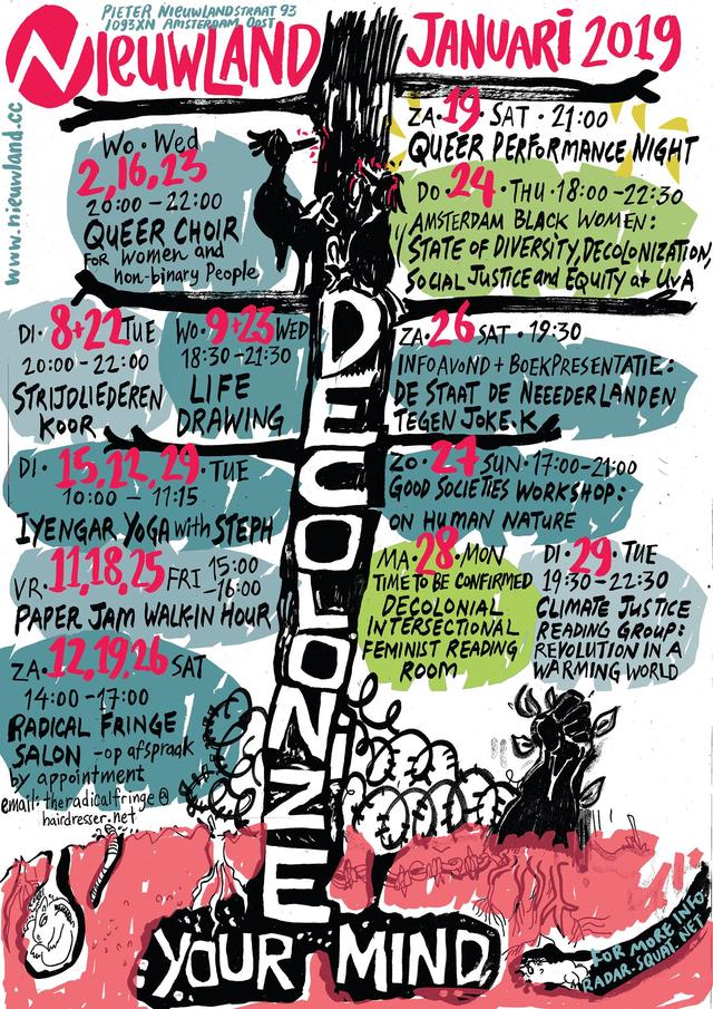 Finally the agenda for January 2019! We are back with regular events and some special events this month, such as: State of diversity, decolonization, social justice and equity at UvA; Decolonial intersectional feminist reading room; infoavond en boekpresentatie: De Staat De Neeederlanden tegen Joke K. Let op! take note: radical fringe salon is now by appointment only/ op afspraak!