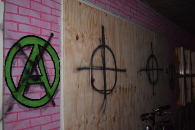 De dag voor de infoavond werd de locatie van het evenement met talloze ‘white power’ symbolen (een aangepaste versie van het Keltisch kruis) beklad. Ook werd er een anti-linkse leus gespoten en stickers geplakt met boodschappen tegen de islam.