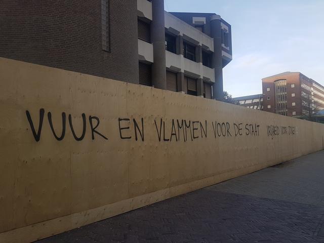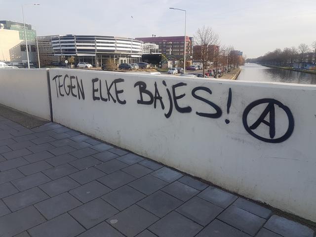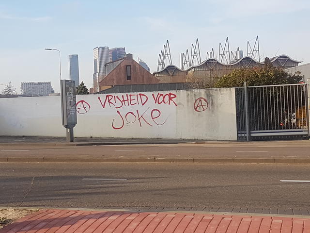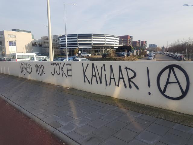 In Den Haag is wat graffiti gespoten in solidariteit met Joke Kaviaar, die momenteel een gevangenisstraf van 10 weken uitzit wegens het schrijven van teksten.