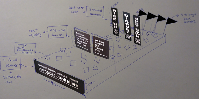 In het blok zal gelopen worden tussen het spandoek 'Capitalism is trashing all life on earth: Compost Capitalism' aan de voorkant en vier zwarte vlaggen aan de achterkant. Daar tussen zullen twee vierkante spandoeken en drie verticale spandoeken met verschillende boodschappen gedragen worden, zie de tekening van het blok hier en onder aan dit bericht. Er zal een klein geluidssysteem zijn voor muziek en het inzetten van slogans en de drummers van Rhythms of Resistance loopt ook mee. Uiteraard zal er genoeg ruimte blijven voor eigen slogans/kreten.