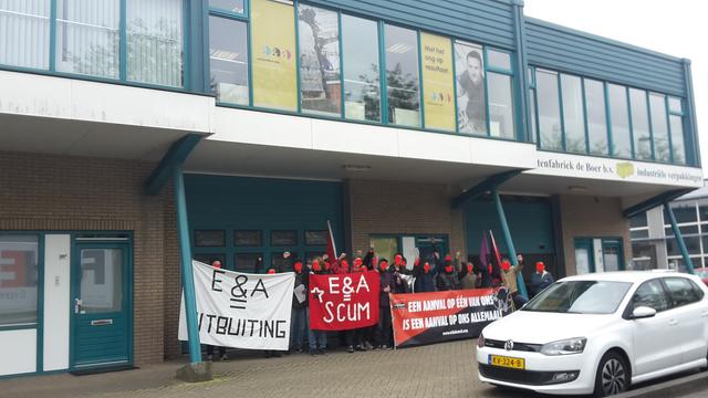 Vandaag hebben we met 20 mensen een picket gehouden voor de deur van een vestiging van E&A uitzendbureau in Zaandam. We hebben pamfletten uitgedeeld aan omstanders en een kort gesprek gehouden met de aanwezige medewerkers van E&A, daar kwam natuurlijk niet veel uit maar de directeur werd wel gebeld en aan hem werd gemeld dat er een protest voor de deur werd gehouden ivm de ex werker Radek uit Polen die op 16 mei zijn rechtszaak heeft i.v.m. zijn actie bij de Poolse Ambassade in Den Haag in oktober 2018.