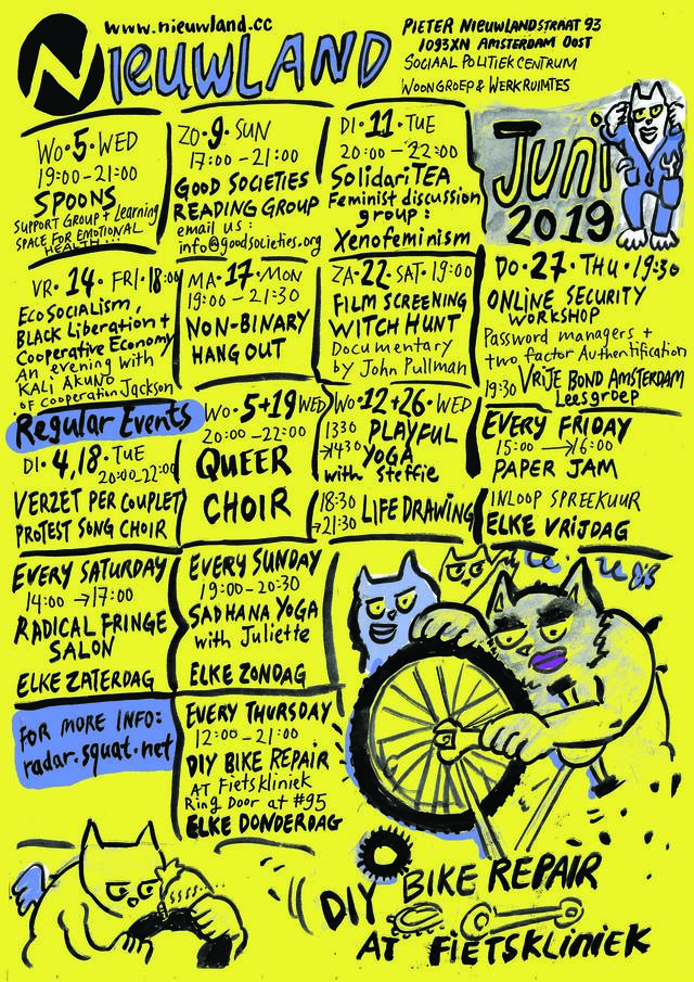 Our programme for June 2019! Among other things, on this month's agenda we have DIY bike repair, a feminist reading group, a non-binary hangout, an online security workshop and an evening on eco-socialism, black liberation and cooperative economy. Join us too for film nights, drawing classes, queer and protest choir, yoga sessions and other regular events.