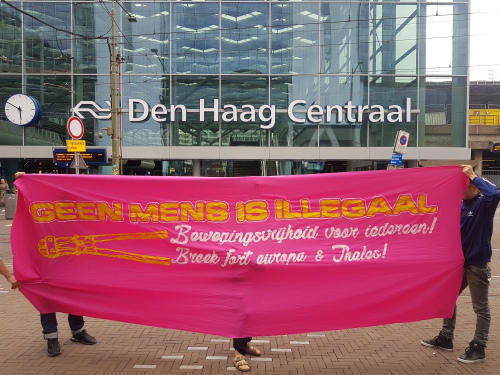 Op vrijdag 19 juli heeft een groep mensen flyers verspreid tijdens de spits op station Den Haag Centraal. De flyers zijn bedoeld om mensen te informeren over het bedrijf Thales en hun rol in het OV-systeem en de militarisering van de Europese grenzen.